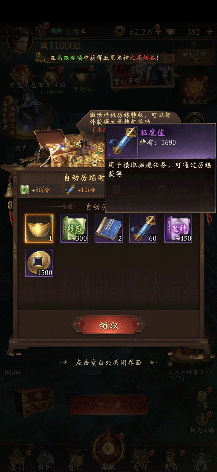 挂机获得派遣点数,用派遣点数和任务所需的鬼神去完成任务,获取任务的奖励;可免费和使用道具刷新出不同品级的任务,品级越高,奖励越好