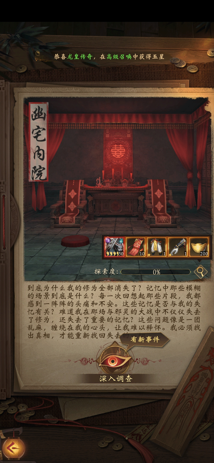 非常有意思的玩法,喜欢鬼神题材的不容错过:丰富的剧情,庞大场景,与npc互动解密一段段精彩的故事,这个先不剧透了,大家自行体验吧,建议体验的时候戴上耳机,效果更好哦!哦对了,探索的过程中是可以控制人物自由走动的,若碰到引导无法完成时,可尝试移动人物走一段距离后再点击引导自动跑图