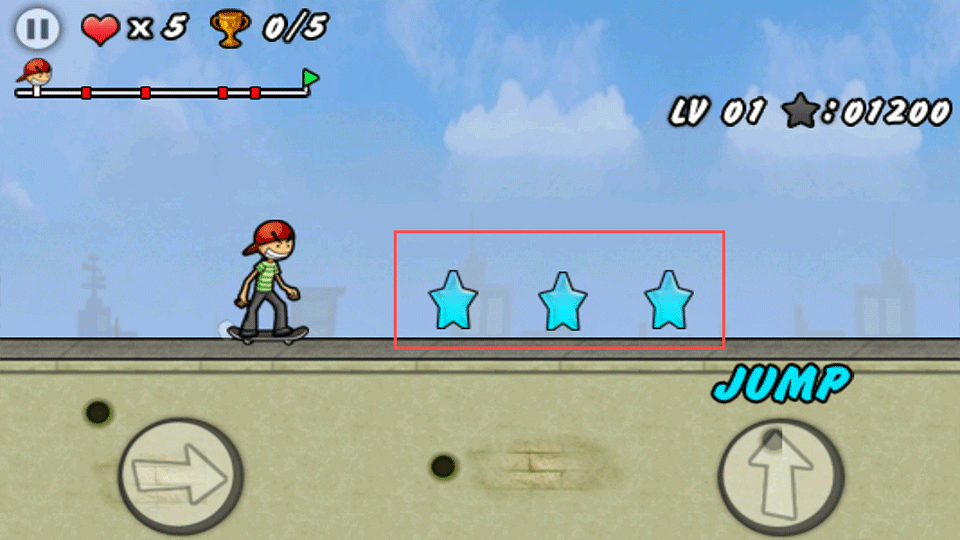 4、游戏正式开始前,你可以先熟悉一下操控方式,左边按钮为加速键,右边按妞为跳跃,当碰见障碍物时就可以运用跳跃键实行