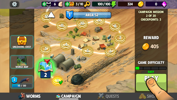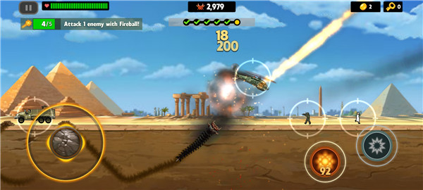3、进入关卡场景当中,左下角的按钮控制蠕虫的左右移动,右下角的按钮控制蠕虫的攻击;