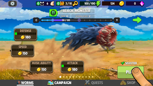 死亡蠕虫(Death Worm)是一款玩起来十分解压的吞噬破坏游戏,在游戏中,你将操控一只巨型蠕虫在地底穿行,不断的吞噬地球上面的物体,钻出地面袭击人类和行驶的汽车,吞噬的越多你将会越强大。随着蠕虫等级的不断提高,人类就会开始进行反击,出动正规军队、坦克、战机等等火力强劲的单位,还会在地面放置炸弹限制蠕虫的走位,一不小心就会被炸掉血,玩起来非常的刺激。