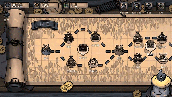 4、进入了关卡界面,关卡内一共有三个章节,通过选择事件推动章节进程,每个章节最后会面临挑战,战胜Boss即可选择“神器”奖励(神器可以大幅增加建造陷阱所需的初始木材资源,并获得强力的全局被动效果),通关三个章节的全部Boss视为胜利,未能守住血量则视为“失败”,但失败也可以获得局外养成的游戏币和经验等资源。