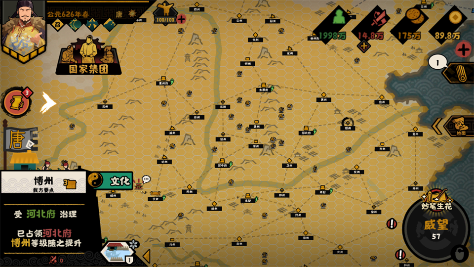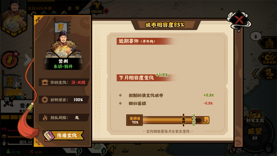 由于波斯文化的城市离大唐得比较远,且初始文化相容度为50。加之本篇攻略考虑的是尽可能避免战斗哈,所以就不采用这种方法。