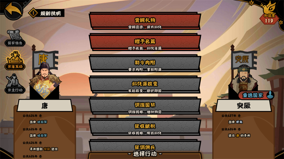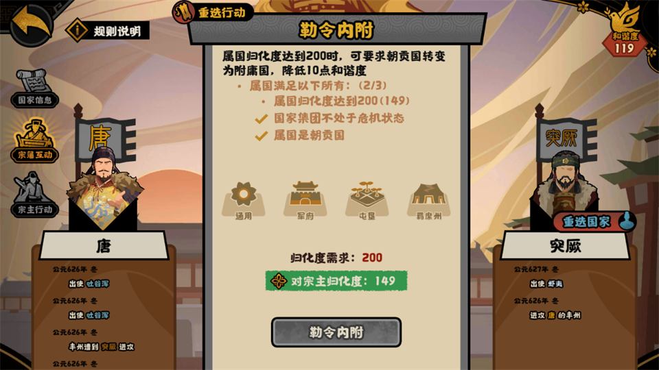 然后在国家集团界面,通过赠送名篇与礼物的方式,进一步提高突厥、吐谷浑的归化度。