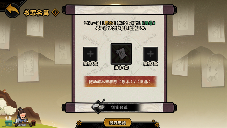 妙笔生花玩法:通过政策、要地生产、国家使命等方式,可以获得【原本】与【灵感】两种特殊资源,在妙笔生花界面,可以以一篇【原本】与两个相性的【灵感】来创作名篇。