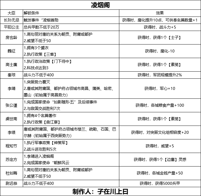 这一阶段也相对来说比较容易,凌烟阁奇观共有14位人才可以解锁,下表列出了所有人才解锁条件与奖励,值得额外说明的是,部分人才的进入凌烟阁后才可招募为名臣,例如李靖、李绩等。