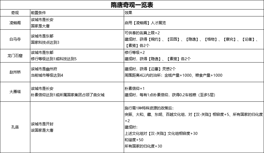 这一阶段也比较容易,大唐开局就可建造的奇观共有6个,可见下表: