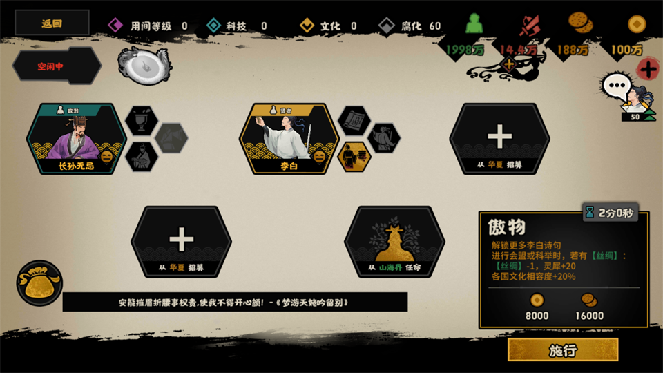 这边个人采用的方法是,在【诗中谪仙·二】国家使命完成后,招募李白作为名臣,并点出对应的政策【傲物】,进而通过科举提高文化相容度,从而完成任务需求。