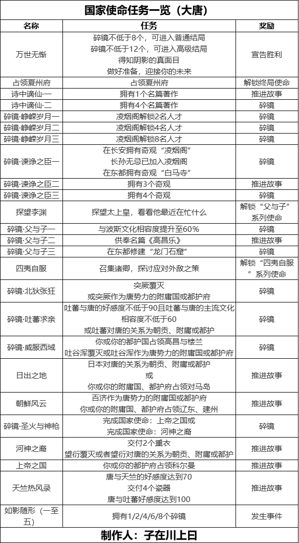 【碎镜·北狄张狂】、【碎镜·吐蕃求亲】、【碎镜·威服西域】、【碎镜·圣火与神枪】、【河神之裔】:这五个国家使命任务,我们一同讲解,由于前文提到了,本攻略尽可能避免战斗,所以这批国家使命任务,我们采用的是使对应国家的关系为朝贡、附庸来完成