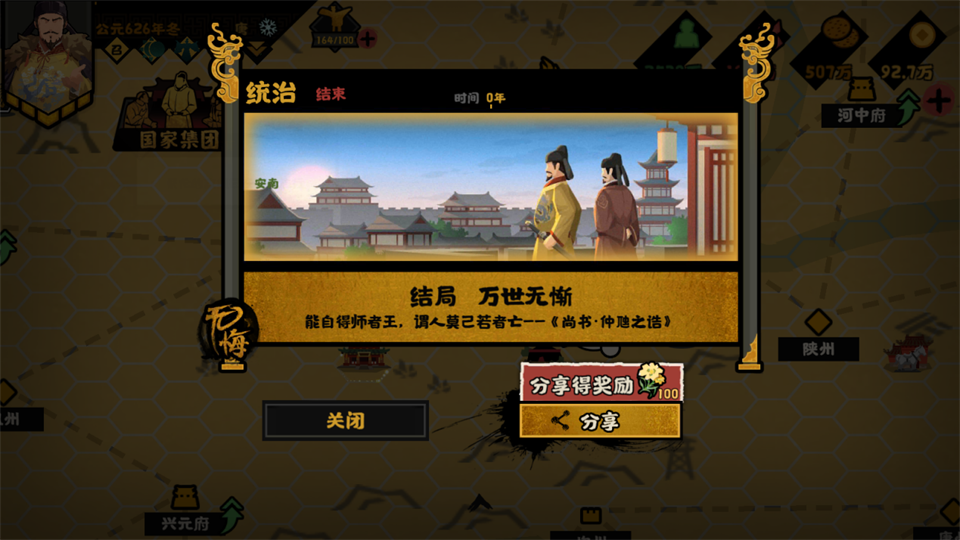 大唐达成【万世无惭】高级结局后,也可同步解锁【贞观之治】普通结局。